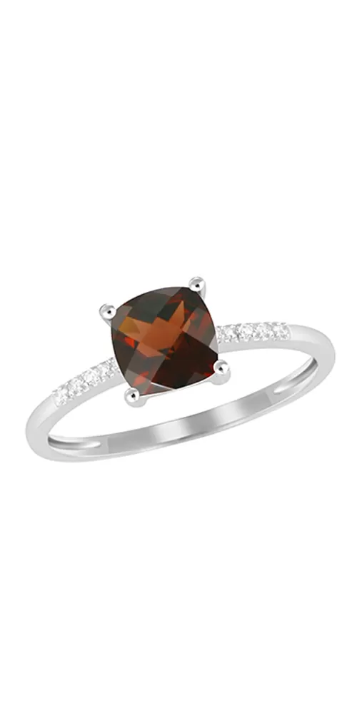 Tento elegantní prsten je vyrobený z bílého čtrnáctikarátového zlata - 585/1000 v lesklé povrchové úpravě. Prsten je zdoben šesti zářivými diamanty briliantového brusu, který zajišťuje maximální brilanci vybroušených facet, dokonale odráží světlo a neuvěřitelné září z každého úhlu pohledu! Diamanty doplňuje přírodní granát ve tvaru polštářku.