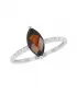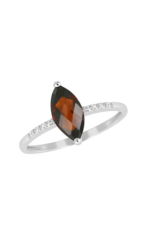 Luxusný dámsky prsteň je vyrobený z bieleho štrnásťkarátového zlata - 585/1000 v lesklej povrchovej úprave. Prsteň je zdobený ôsmimi žiarivými diamantmi briliantového brusu a jedným prírodným granátom v tvare slzičky.