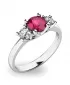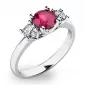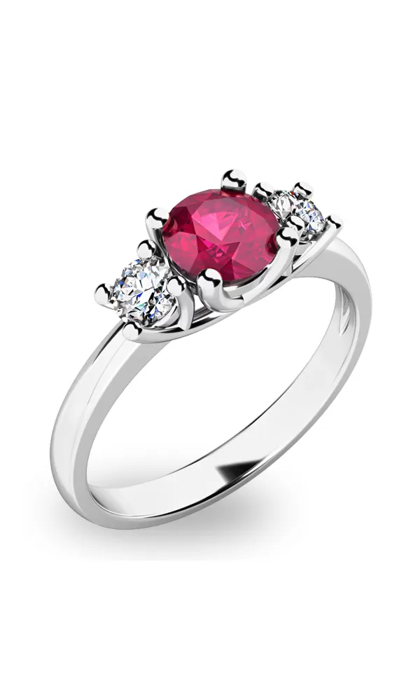 Tento ženský prsteň je vyrobený z bieleho štrnástich karátových zlatých s čistotou 585/1000 v lesklom povrchu.  Vedľa rubínu sú dva menšie diamanty.… Celý popis