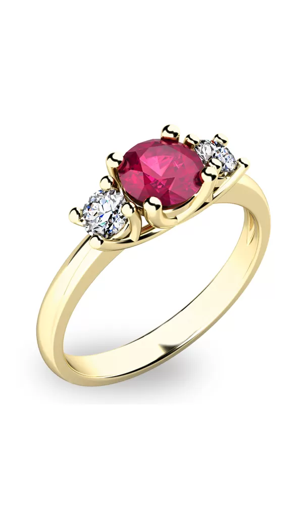 Tento dámsky prsteň je vyrobený zo žltého štrnástich karátového zlata s rýdzosťou 585/1000 v lesklej povrchovej úprave. Dominantou celého prsteňa je prírodný rubín v briliantovom bruse, ktorý pozdvihne váš vzhľad a zaujme všetkých vo vašom vzhľade okolie. Vedľa rubínu sú vsadené dva menšie diamanty. Všetky kamene držia silné uchytenie, ktoré je nádherné a prepracované aj pri bočnom pohľade. Elegantná jednoduchá obrúčka podčiarkuje krásu a ladnosť prsteňa.