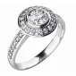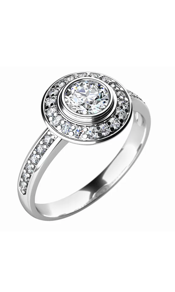 Luxusný diamantový prsteň je vyrobený z bieleho štrnásťkarátového zlata - 585/1000 v lesklej povrchovej úprave. Prsteň je vysadený jedným veľkým okrúhlym diamantom a 30 menšími diamantmi.