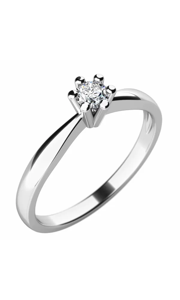Elegantný dámsky prsteň - soliter s jedným diamantom je vyrobený zo štrnásťkarátového zlata - 585/1000 v lesklej povrchovej úprave. Prsteň má jeden okrúhly diamant vybrúsený briliantovým brusom vsadený do šesťkrapnovej korunky.