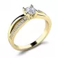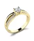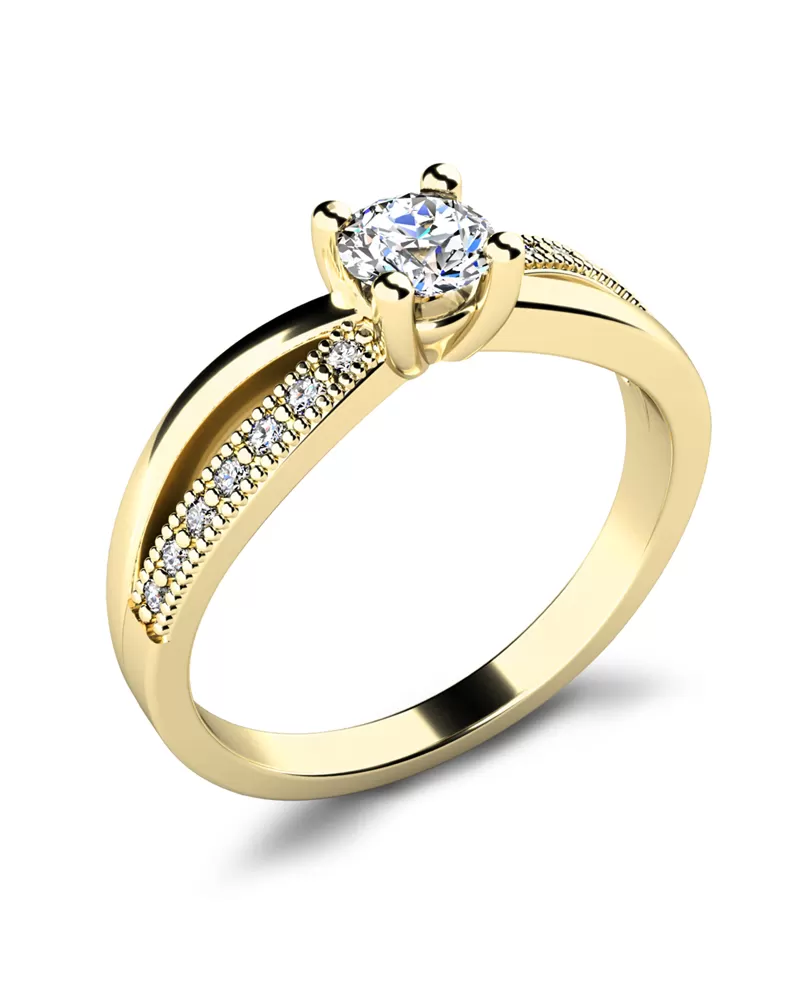 Elegantní prsten je vyroben ze žlutého čtrnáctikarátového zlata - 585/1000 v lesklé povrchové úpravě. Prstenu dominuje středový kulatý diamant, který je uchycený do čtyřkrapnové korunky. Toto uchycení nechá diamantu dokonale vyniknout v jeho kráse a brusu. Pro dokonalé zvýraznění prstenu je na každé straně v obroučce vsazeno sedm kulatých diamantů, které prsten zjemňují. Všechny diamanty mají briliantový brus, který zajišťuje maximální brilanci vybroušených facet, dokonale odráží světlo a diamanty krásně září z každého úhlu pohledu! Díky skladbě a stylově čistému vsazení diamantů, prsten vyniká krásnou brilancí kamenů. Vsazování diamantů do prstenů provádějí naši nejzkušenější mistři zlatníci ručně pod mikroskopem s přesností na 0,01mm a proto nehrozí vypadnutí kamínků jako to bývá u strojně vyráběných prstenů.