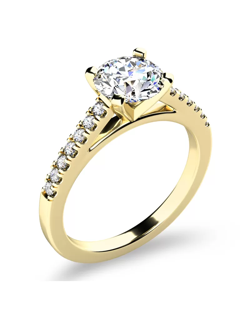 Luxusný prsteň je vyrobený zo žltého štrnásťkarátového zlata - 585/1000 v lesklej povrchovej úprave. Prsteň má jeden hlavný dominantný diamant okrúhleho briliantového brusu, ktorý je uchytený do štvorkrapňovej korunky. Toto uchytenie nechá diamant dokonale vyniknúť v jeho kráse a bruse. Po stranách v obrúčke prsteňa je vsadených na každej strane 7 žiarivých diamantov, ktoré prsteň zjemňujú. Všetky diamanty majú briliantový brús, ktorý zaisťuje maximálnu brilanciu vybrúsených facet, dokonale odráža svetlo a neuveriteľné žiari z každého uhla pohľadu!