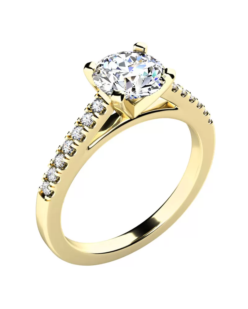 Luxusní prsten je vyroben ze žlutého čtrnáctikarátového zlata - 585/1000 v lesklé povrchové úpravě. Prsten má jeden hlavní dominantní diamant kulatého briliantového brusu, který je uchycený do čtyřkrapnové korunky. Toto uchycení nechá diamant dokonale vyniknout v jeho kráse a brusu. Po stranách v obroučce prstenu je vsazeno na každé straně 7 zářivých diamantů, které prsten zjemňují. Všechny diamanty mají briliantový brus, který zajišťuje maximální brilanci vybroušených facet, dokonale odráží světlo a neuvěřitelné září z každého úhlu pohledu!