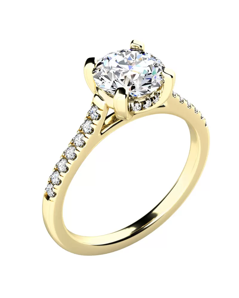 Tento diamantový prsten je vyroben ze žlutého čtrnáctikarátového zlata - 585/1000 v lesklé povrchové úpravě. Prsten má jeden hlavní dominantní diamant kulatého briliantového brusu, který je uchycený do čtyřkrapnové korunky. Toto uchycení pomůže diamantu dokonale vyniknout jeho kráse a brusu. Krásným detailem je vsazení diamantů i na boku korunky. Po stranách v obroučce prstenu je vsazeno 14 diamantů, které prsten zjemňují. Prsten ohromí z každé strany. Všechny diamanty jsou vybroušeny briliantovým brusem, který zajišťuje maximální brilanci vybroušených facet, dokonale odráží světlo a neuvěřitelné září z každého úhlu pohledu! Díky skladbě a stylově čistému vsazení diamantů, vyniká prsten krásnou brilancí kamenů. Vsazování diamantů do prstenů provádějí naši nejzkušenější mistři zlatníci ručně pod mikroskopem s přesností na 0,01mm a proto nehrozí vypadnutí kamínků jako to bývá u strojně vyráběných prstenů.