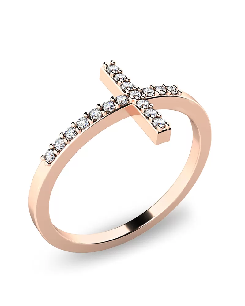 Dizajnový prsteň v tvare kríža, je vyrobený z ružového štrnástich karátového zlata - 585/1000 v lesklej povrchovej. Diamanty sú vybrúsené okrúhlym briliantovým brusom, ktorý zaisťuje maximálnu brilanciu vybrúsených facet, dokonale odráža svetlo a neuveriteľné žiari z každého uhla pohľadu! Vsadzovanie diamantov vykonávajú naši najskúsenejší majstri zlatníci ručne pod mikroskopom s presnosťou na 0,01mm a preto nehrozí vypadnutie kamienkov ako to býva pri strojne vyrábaných prsteňoch.