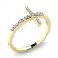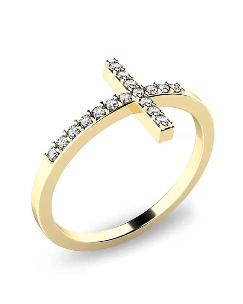 Dizajnový prsteň v tvare kríža, je vyrobený zo žltého štrnástich karátového zlata - 585/1000 v lesklej povrch. Diamanty sú vybrúsené okrúhlym briliantovým brusom, ktorý zaisťuje maximálnu brilanciu vybrúsených facet, dokonale odráža svetlo a neuveriteľné žiari z každého uhla pohľadu! Vsadzovanie diamantov vykonávajú naši najskúsenejší majstri zlatníci ručne pod mikroskopom s presnosťou na 0,01mm a preto nehrozí vypadnutie kamienkov ako to býva pri strojne vyrábaných prsteňoch.