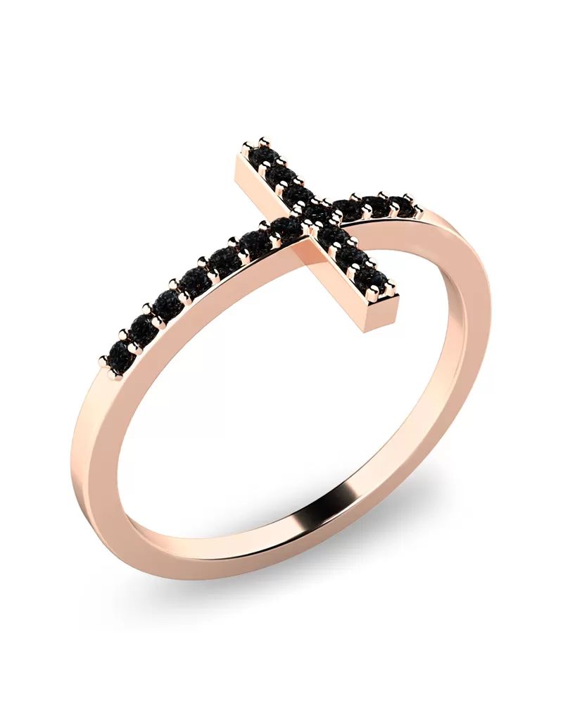 Dizajnový prsteň v tvare kríža, je vyrobený z ružového štrnástich karátového zlata - 585/1000 v lesklej povrchovej sú vybrúsené okrúhlym briliantovým brusom. Vsadzovanie diamantov vykonávajú naši najskúsenejší majstri zlatníci ručne pod mikroskopom s presnosťou na 0,01mm a preto nehrozí vypadnutie kamienkov ako to býva pri strojne vyrábaných prsteňoch.