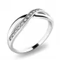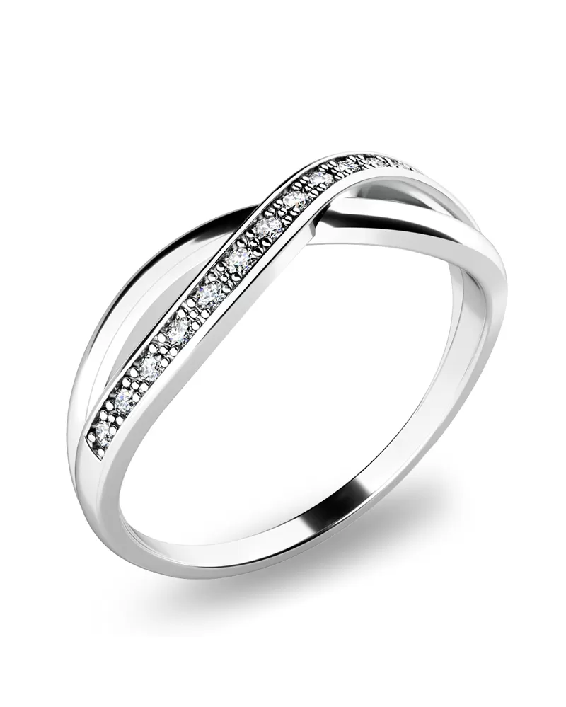 Prsteň jednoduchého dizajnu, kde prepletená ozdoba plynule prechádza v obrúčku prsteňa. Prsteň je vyrobený z bieleho štrnástich karátového zlata - 585/1000 v lesklej povrchovej úprave. Diamanty sú vybrúsené okrúhlym briliantovým brusom, ktorý zaisťuje maximálnu brilanciu vybrúsených facet, dokonale odráža svetlo a neuveriteľné žiari z každého uhla pohľadu! Vsadzovanie diamantov vykonávajú naši najskúsenejší majstri zlatníci ručne pod mikroskopom s presnosťou na 0,01mm a preto nehrozí vypadnutie kamienkov ako to býva pri strojne vyrábaných prsteňoch.