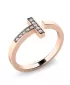 Prsteň moderného dizajnu je vyrobený z ružového štrnástich karátového zlata - 585/1000 v lesklej povrchovej úprave. Diamanty sú vybrúsené okrúhlym… Celý popis