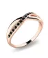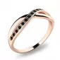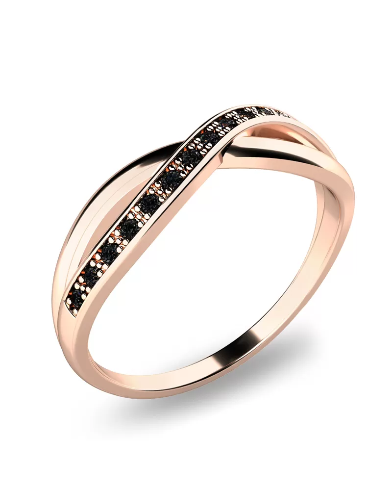 Prsteň jednoduchého dizajnu, kde prepletená ozdoba plynule prechádza v obrúčku prsteňa. Prsteň je vyrobený z ružového štrnástich karátového zlata - 585/1000 v lesklej povrchovej úprave s čiernymi diamantmi, ktoré sú vybrúsené okrúhlym briliantovým brusom. Vsadzovanie diamantov vykonávajú naši najskúsenejší majstri zlatníci ručne pod mikroskopom s presnosťou na 0,01mm a preto nehrozí vypadnutie kamienkov ako to býva pri strojne vyrábaných prsteňoch.