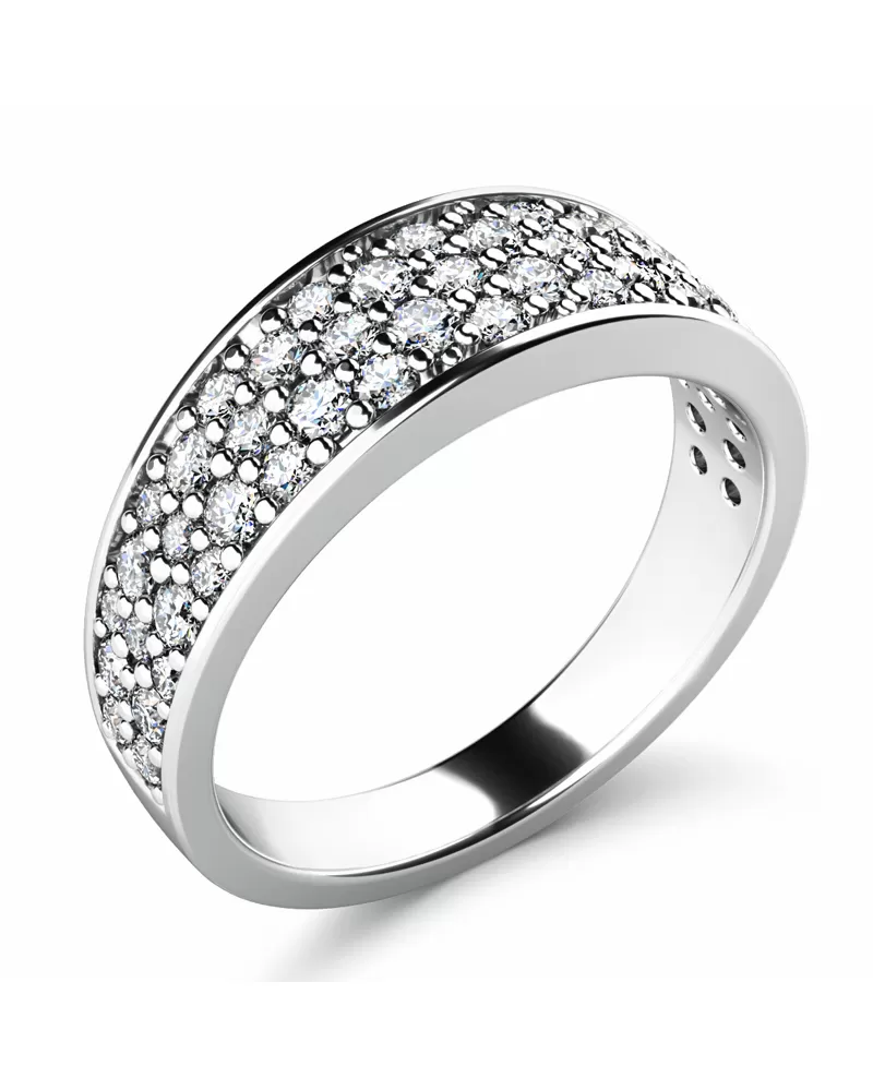 Nádherný dámský prsten je vyroben z bílého čtrnáctikarátového zlata - 585/1000 v lesklé povrchové úpravě. Obroučka prstenu je v horní části osázena kulatými diamanty, které jsou vybroušeny kulatým briliantovým brusem. Tento brus zajišťuje maximální brilanci vybroušených facet, dokonale odráží světlo a neuvěřitelně září z každého úhlu pohledu! Vsazování diamantů do prstenů provádějí naši nejzkušenější mistři zlatníci ručně pod mikroskopem s přesností na 0,01mm a proto nehrozí vypadnutí kamínků jako to bývá u strojně vyráběných prstenů. Prsten je čistého designu v klasickém provedení, který patří stále k nejoblíbenějším typům prstenů. Díky skladbě a stylově čistému vsazení diamantů vyniká prsten krásnou brilancí kamenů a působí luxusním dojmem!