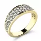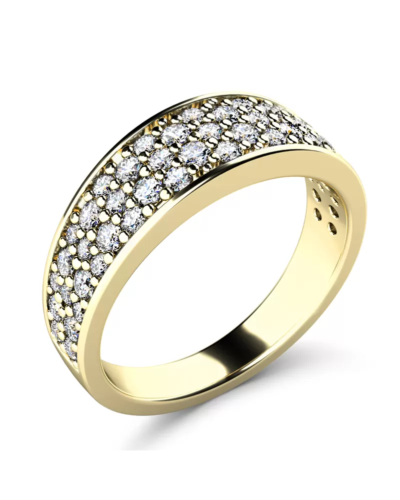 Nádherný dámský prsten je vyroben ze žlutého čtrnáctikarátového zlata - 585/1000 v lesklé povrchové úpravě. Obroučka prstenu je v horní části osázena kulatými diamanty, které jsou vybroušeny kulatým briliantovým brusem. Tento brus zajišťuje maximální brilanci vybroušených facet, dokonale odráží světlo a neuvěřitelně září z každého úhlu pohledu! Vsazování diamantů do prstenů provádějí naši nejzkušenější mistři zlatníci ručně pod mikroskopem s přesností na 0,01mm a proto nehrozí vypadnutí kamínků jako to bývá u strojně vyráběných prstenů. Prsten je čistého designu v klasickém provedení, který patří stále k nejoblíbenějším typům prstenů. Díky skladbě a stylově čistému vsazení diamantů vyniká prsten krásnou brilancí kamenů a působí luxusním dojmem!