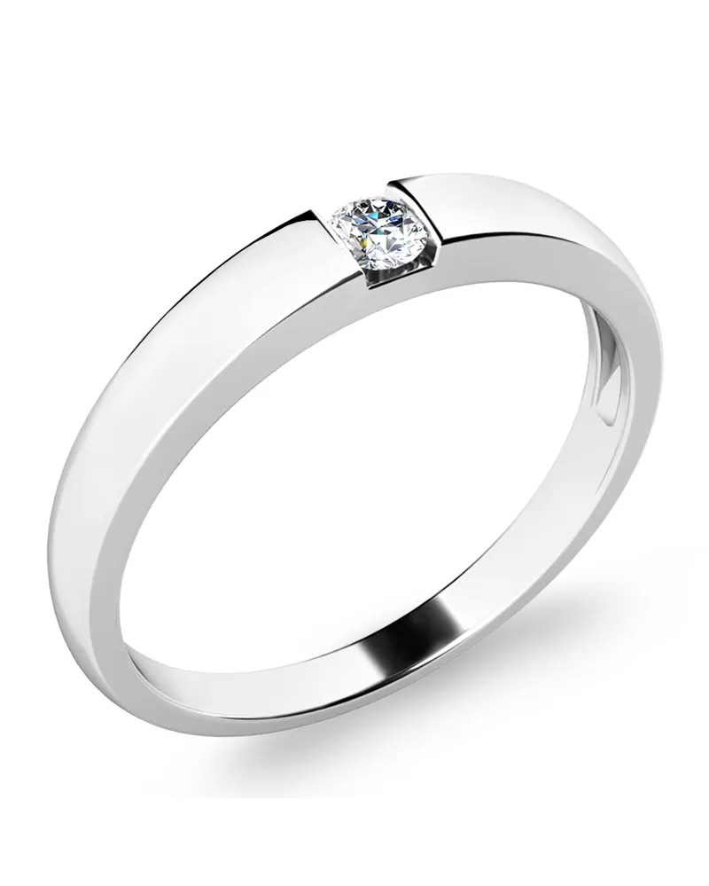Elegantný a praktický dámsky prsteň je vyrobený z bieleho štrnásťkarátového zlata - 585/1000 v lesklej povrchovej úprave. V prsteni je vsadený jeden okrúhly diamant, ktorý spája obrúčku prsteňa. Diamant je vybrúsený briliantovým brusom Signity star, ktorý zaisťuje maximálnu brilanciu kameňa. Vsadzovanie diamantov do prsteňov vykonávajú naši najskúsenejší majstri zlatníci ručne pod mikroskopom s presnosťou na 0,01mm a preto nehrozí vypadnutie kamienkov ako to býva u strojne vyrábaných prsteňov.