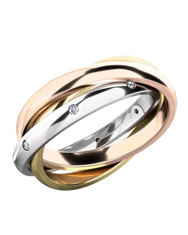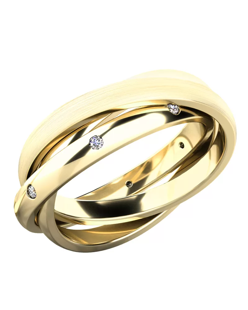 Designový prsten, který je složen ze tří propojených kroužků potěší každou ženu, které ho darujete. Prsten je vyroben z bílého čtrnácti karátového zlata - 585/1000 v lesklé povrchové úpravě. V jednom kroužku je vsazeno po obvodu osm diamantů. Diamanty jsou vybroušený kulatým briliantovým brusem, který zajišťuje maximální brilanci vybroušených facet, dokonale odráží světlo a neuvěřitelné září z každého úhlu pohledu! Vsazování diamantů provádějí naši nejzkušenější mistři zlatníci ručně pod mikroskopem s přesností na 0,01mm a proto nehrozí vypadnutí kamínků jako to bývá u strojně vyráběných prstenů.