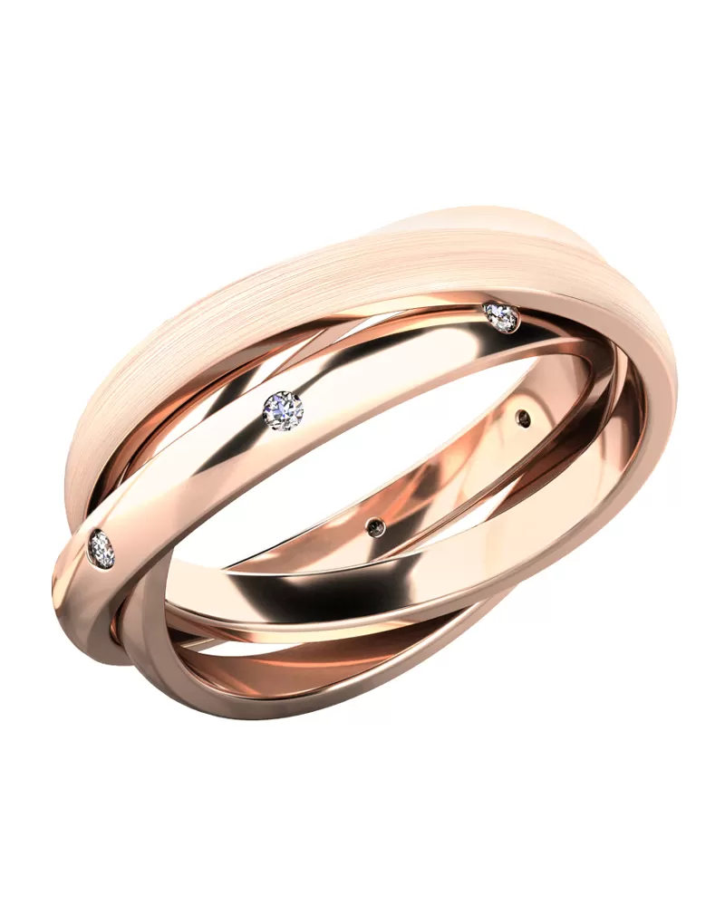 Designový prsten, který je složen ze tří propojených kroužků potěší každou ženu, které ho darujete. Prsten je vyroben ze žlutého čtrnácti karátového zlata - 585/1000 v lesklé povrchové úpravě. V jednom kroužku je vsazeno po obvodu osm diamantů. Diamanty jsou vybroušený kulatým briliantovým brusem, který zajišťuje maximální brilanci vybroušených facet, dokonale odráží světlo a neuvěřitelné září z každého úhlu pohledu! Vsazování diamantů provádějí naši nejzkušenější mistři zlatníci ručně pod mikroskopem s přesností na 0,01mm a proto nehrozí vypadnutí kamínků jako to bývá u strojně vyráběných prstenů.