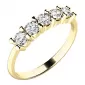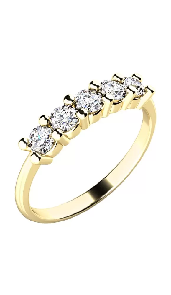 Nádherný diamantový prsteň je vyrobený zo žltého štrnásťkarátového zlata - 585/1000 v lesklej povrchovej úprave. Prsteň je vysadený piatimi žiarivými diamantmi, ktoré perfektne vyniknú vďaka zúženej obrúčke.
