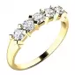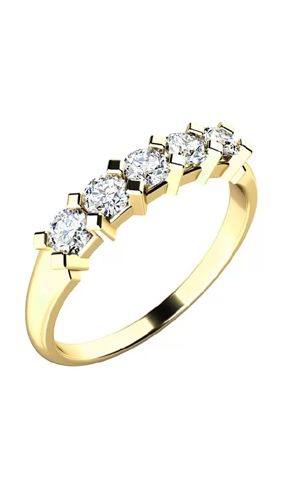 Nádherný diamantový prsteň je vyrobený zo žltého štrnásťkarátového zlata - 585/1000 v lesklej povrchovej úprave. Prsteň je vysadený piatimi žiarivými diamantmi okrúhleho tvaru a briliantového výbrusu.