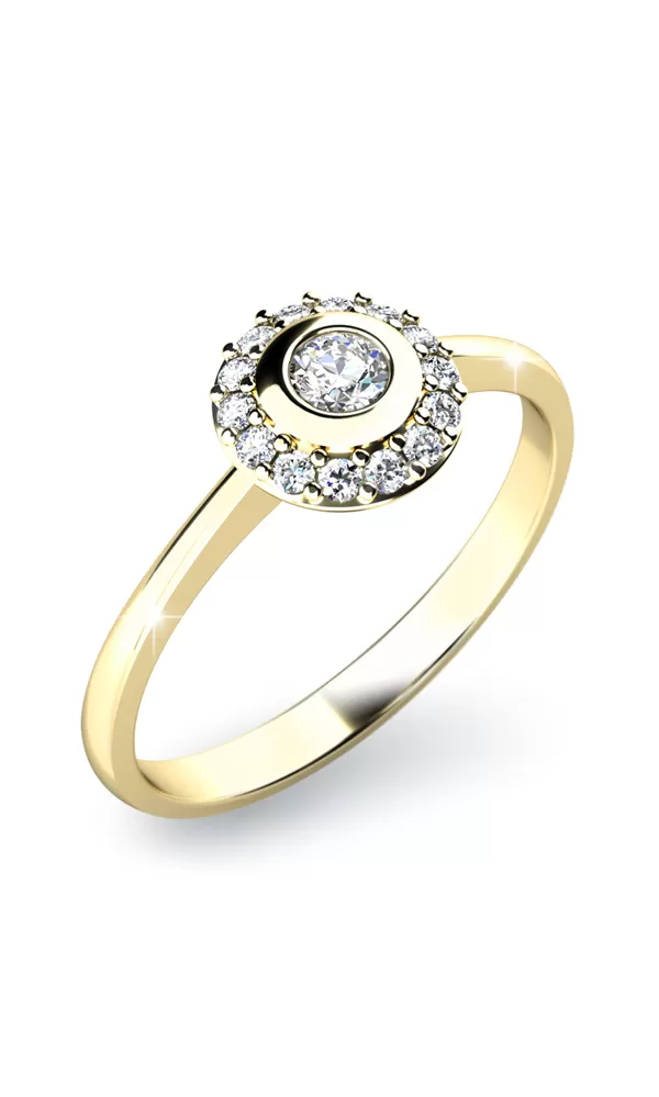 Žiarivý dámsky prsteň vyrobený zo žltého štrnásťkarátového zlata - 585/1000 v lesklej povrchovej úprave. Prsteň je osadený pätnástimi diamantmi vybrúsenými briliantovým brusom - jedným stredovým diamantom a štrnástimi menšími diamantmi vsadenými okolo stredového diamantu. Vďaka tomuto zoskupeniu diamantov a ich brilancii je tento prsteň naozaj žiarivý - zaručene oslní každú ženu!