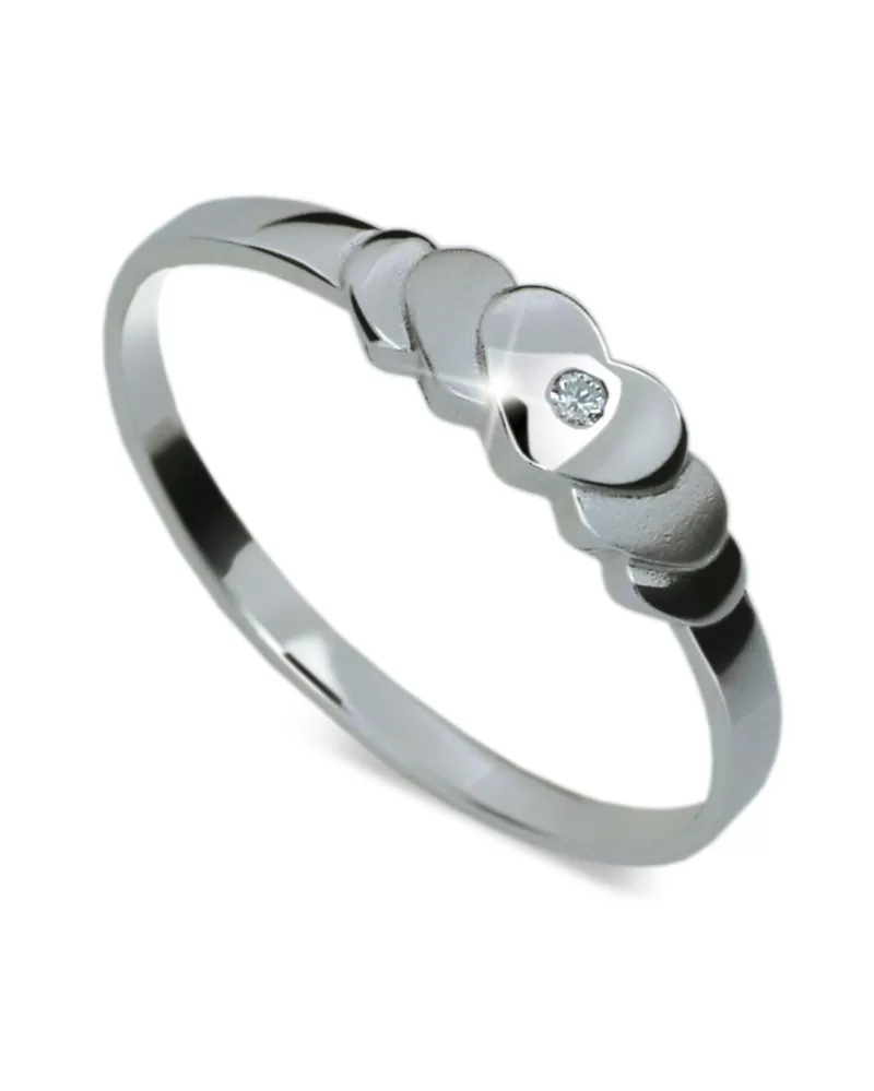Romantický prsteň so srdiečkami je zdobený jedným, okrúhlym diamantom. Diamant je v briliantovom bruse, ktorý zaisťuje maximálnu brilanciu vybrúsených facet, dokonale odráža svetlo a neuveriteľne žiari z každého uhla pohľadu! Vsadzovanie diamantov vykonávajú naši najskúsenejší majstri zlatníci ručne pod mikroskopom s presnosťou na 0,01mm a preto nehrozí vypadnutie kamienkov ako to býva u strojne vyrábaných príveskov. Šperk je vyrobený z bieleho štrnásťkarátového zlata - 585/1000 v kombinácii lesklej a matnej povrchovej úprave.