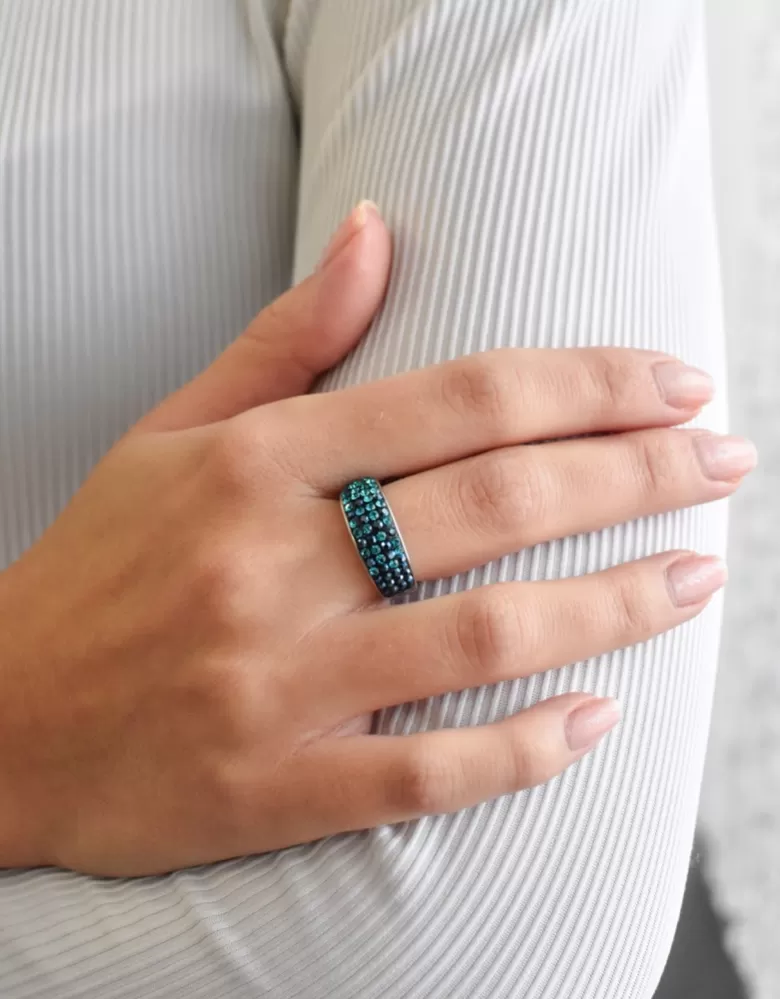 Luxusne vyzerajúci strieborný prsteň vysadený kryštálmi zelenej farby ozdobí prstenník každej ženy.