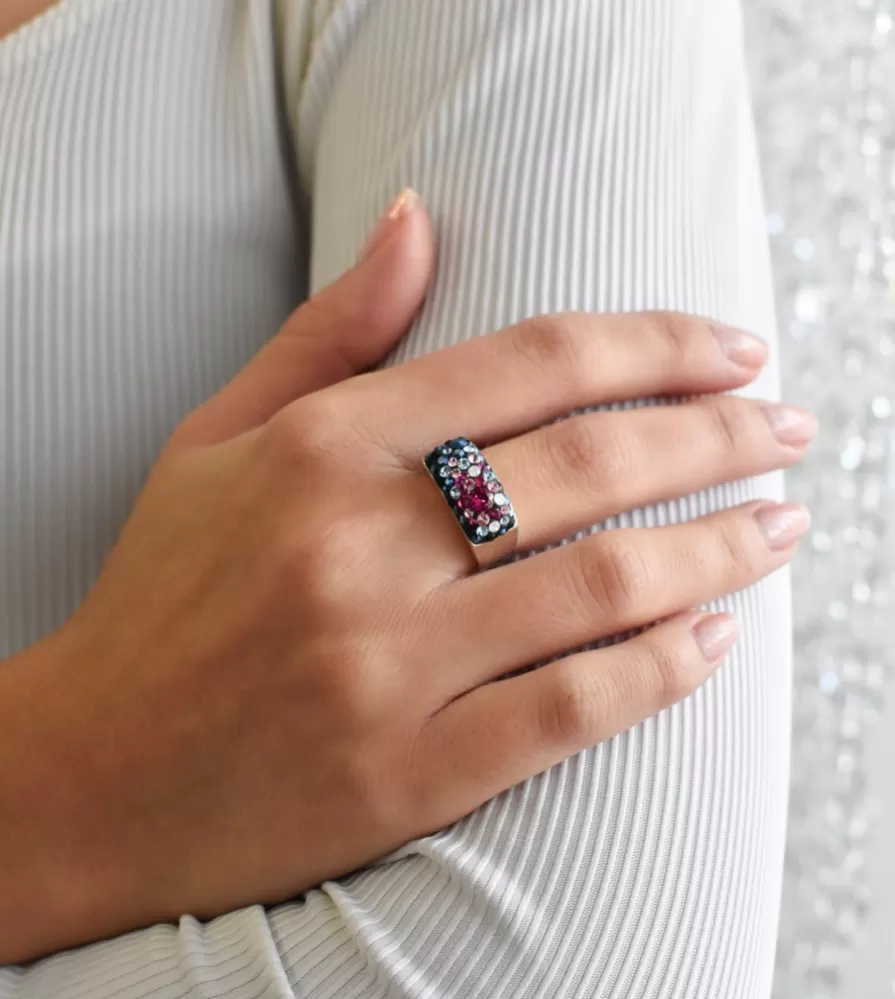 Prsteň je vyrobený zo striebra o rýdzosti 925/1000, ktoré prešlo povrchovou úpravou ródiom. Rhodium váš prsteň ochráni proti sčernaniu, zožltnutiu i poškriabaniu. Kvalitné striebro dopĺňajú trblietavé Swarovski kryštály v tajomných farbách - tmavo modrej, čiernej a ružovej. Keďže šperk neobsahuje nikel, môžu ho bez obáv nosiť aj alergici.