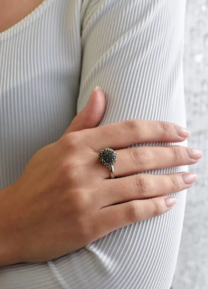 Prsteň v tvare hrče 735013.5 je vyrobený z kvalitného striebra s rýdzosťou 925/1000 vrátane povrchovej úpravy ródiom. Šperk je vysadený trblietavými kryštálmi v zaujímavej zelenej farbe. Keďže šperk neobsahuje prídavok niklu, môžu ho bez obáv nosiť aj alergici