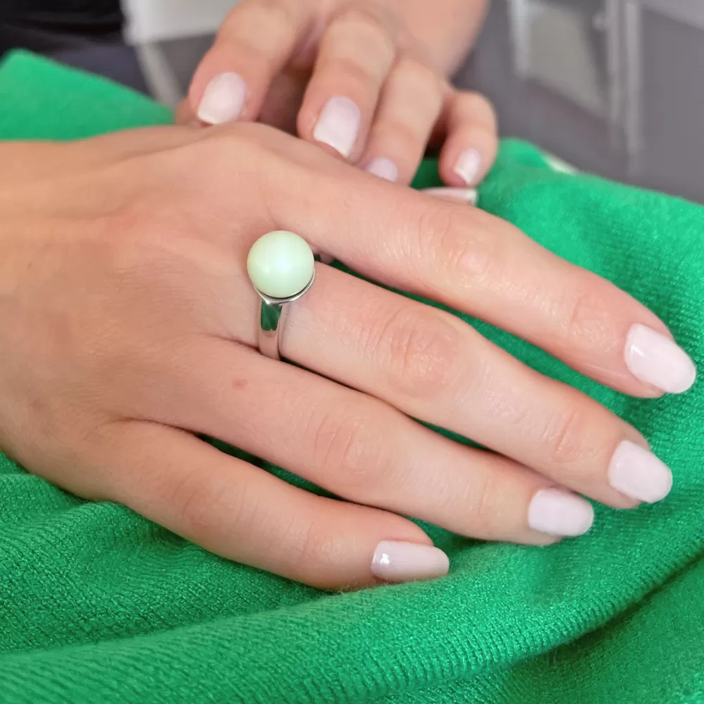 Rozveseľte svoj outfit originálnym farebným šperkom. Čo napríklad strieborným prsteňom s pastelovo zelenou Swarovski perlou?