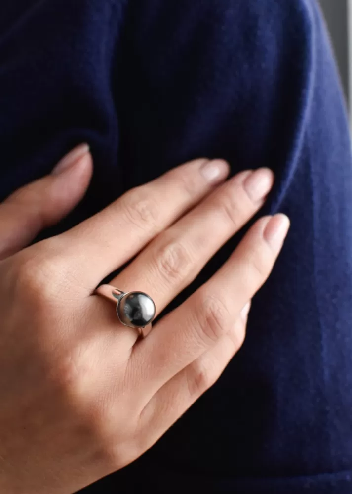 Prsteň je vyrobený zo striebra rýdzosti 925/1000 s povrchovou úpravou ródiom a je osadený jednou veľkou výraznou Swarovski perlou v šedej farbe. Veľkosť perly je 10 mm. Šperk neobsahuje nikel, a tak ho môžu bez obáv nosiť aj alergici.