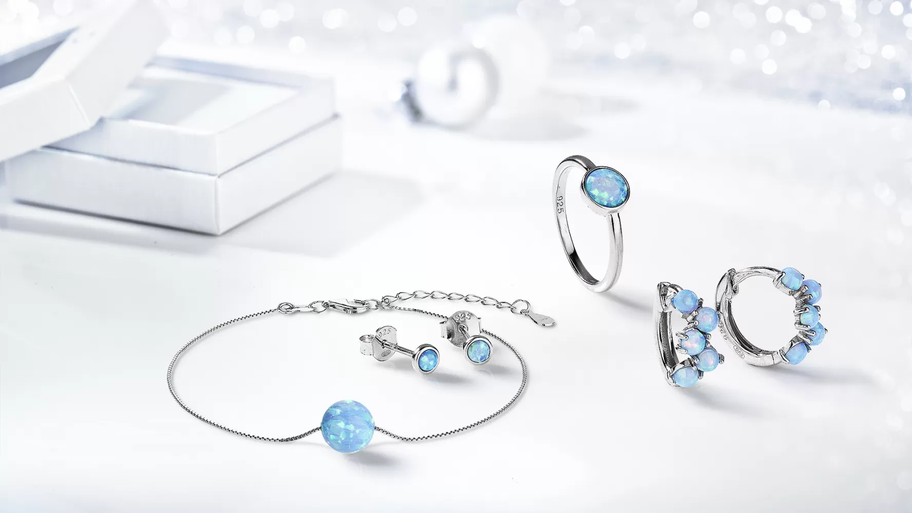 Zdobí ho okrúhly syntetický opál vo svetlo modrej farbe.