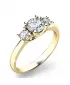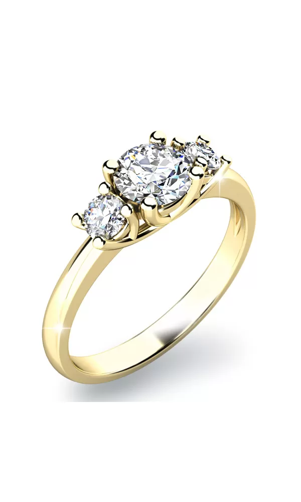 Zásnubný prsteň vyrobený zo žltého štrnásťkarátového zlata - 585/1000 v lesklej povrchovej úprave. Nádherný zásnubný prsteň žiari mimoriadnym leskom a to vďaka trom diamantom briliantového brusu. Diamanty sú dvoch veľkostí. Uprostred dominuje veľký diamant a strážia ho dva menšie diamanty. Všetky diamanty držia silné uchytenie, ktoré je nádherné a prepracované aj pri bočnom pohľade. Elegantná jednoduchá obrúčka podčiarkuje krásu a ladnosť prsteňa.