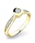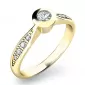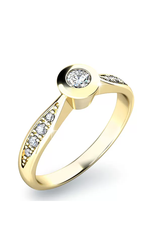 Zásnubný prsteň vyrobený zo žltého štrnásťkarátového zlata - 585/1000 v lesklej povrchovej úprave. Romantický prsteň je tvorený z hlavného diamantu briliantového brusu, ktorý je vsadený do vyvýšenej obruby. Obrúčka prsteňa sa po stranách mierne rozširuje a ukrýva na každej strane štyri diamanty. Prsteň pôsobí veľmi luxusne a romanticky. Prsteň vyrábame a je skladom aj v žltom zlate.