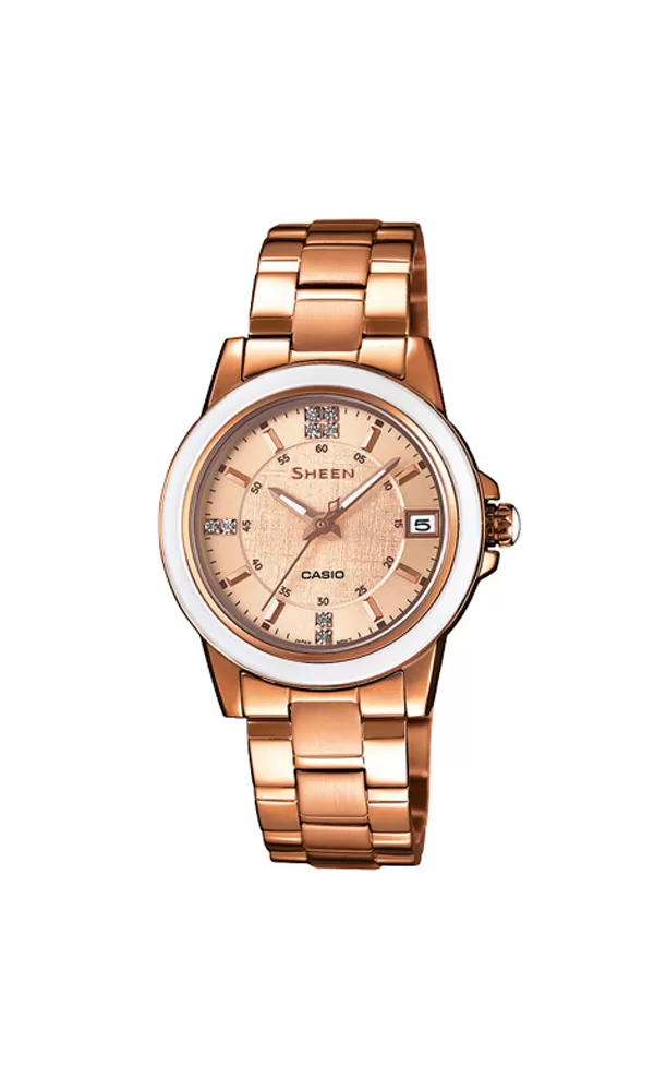 Dámske štýlové hodinky CASIO z kolekcie SHEENs keramickým okružím puzdra a zafírovým sklíčkom. Hodinky majú klasické prevedenie s pozláteným oceľovým náramkom v ružovej farbe a ružovým ciferníkom. Hodinky obsahujú navyše na ciferníku originálne Swarovski kryštály, ktorými sú osadené indexy.