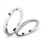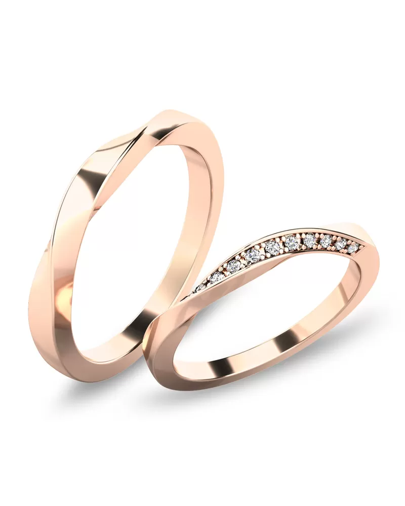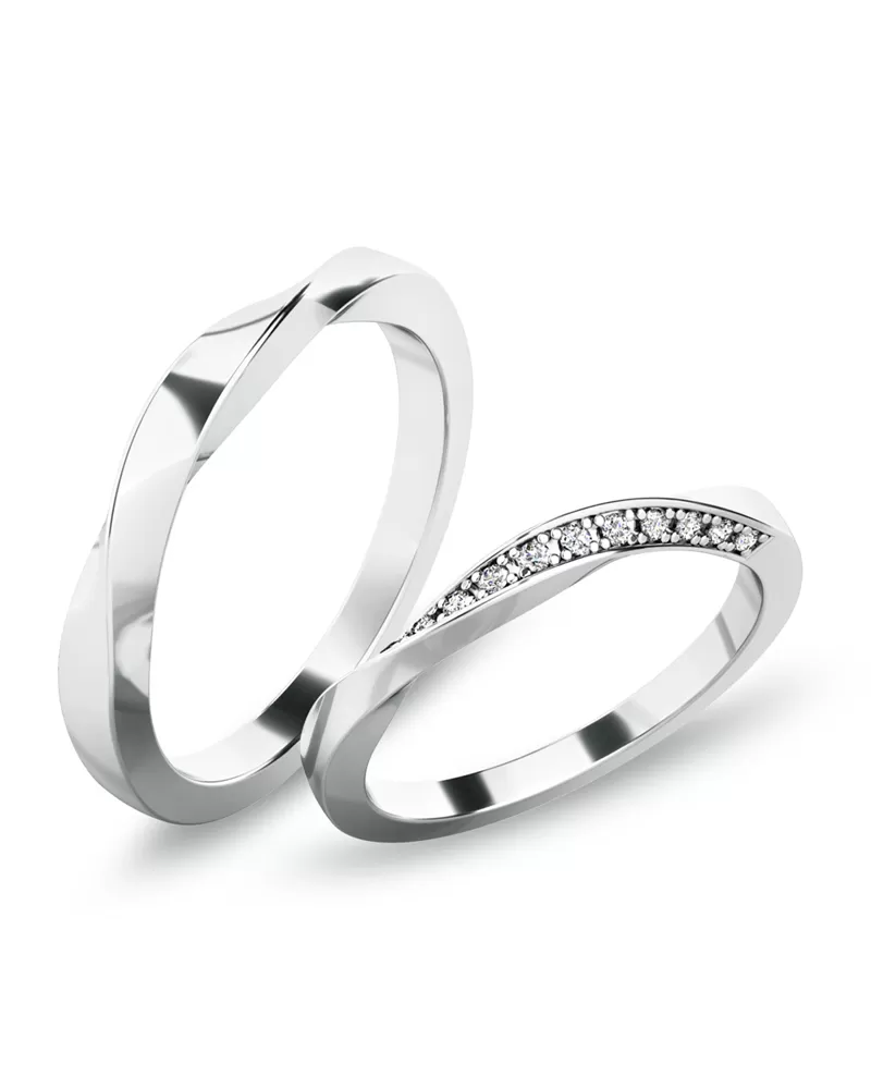 Snubné prstene moderného dizajnu v rovnom profile sú vyrobené z bieleho štrnásťkarátového zlata 585/1000 v lesklej povrchovej úprave. Na oboch prsteňoch je prekrútená obrúčka, kde v dámskom prsteni je vsadených 13 ks okrúhlych zirkónov s briliantovým brusom Signity star, ktorý dodáva zirkónom oslnivú brilanciu. Do snubných prsteňov si môžete nechať staviť aj diamanty. Kamene sú do prsteňa vsadené "do krapničiek". Vsadzovanie zirkónov aj diamantov vykonávajú naši najskúsenejší majstri zlatníci ručne pod mikroskopom s presnosťou na 0,01 mm a preto nehrozí vypadnutie kamienkov ako to býva u strojne vyrábaných snubných prsteňov.