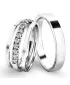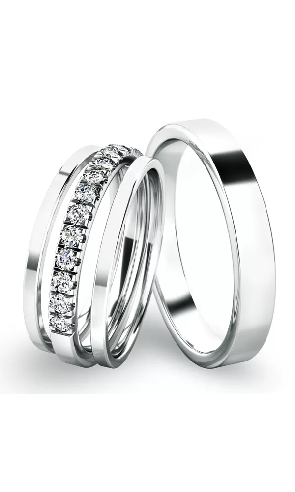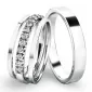 Novinka pre tento rok! Set snubných prsteňov je vyrobený z bieleho štrnásťkarátového zlata 585/1000. Prstene majú vonkajší rovný profil a sú v lesklej povrchovej úprave, samozrejme je možné akýkoľvek prsteň vyrobiť v matnej povrchovej úprave. Snubné prstene majú vnútorné Fit Profil - polguľatú vnútornú stranu pre príjemnejšie nosenie, nasadzovanie a odnímanie. V dámskom prsteni je vsadených 13ks okrúhlych zirkónov s briliantovým brusom Signity star, ktorý dáva zirkónom oslnivú brilanciu. Do snubných prsteňov si môžete nechať staviť aj diamanty. Kamene sú do prsteňa vsadené "do krapničiek". Vsadzovanie zirkónov aj diamantov vykonávajú naši najskúsenejší majstri zlatníci ručne pod mikroskopom s presnosťou na 0,01 mm a preto nehrozí vypadnutie kamienkov ako to býva u strojne vyrábaných snubných prsteňov.
