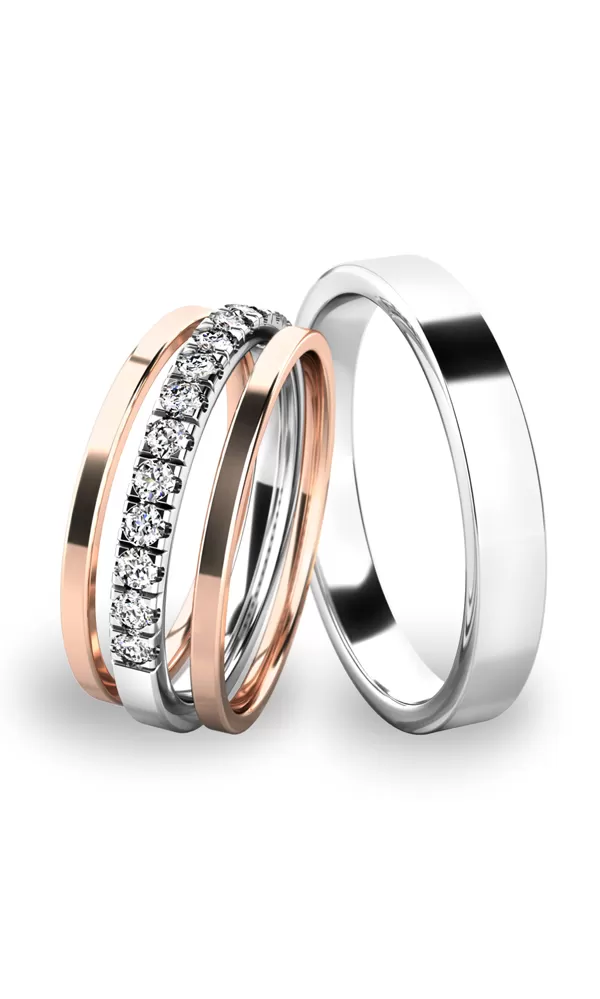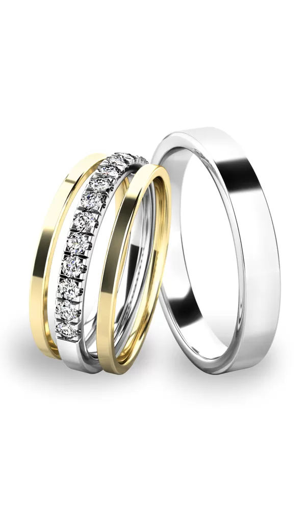 Novinka pre tento rok! Set snubných prsteňov je vyrobený zo štrnásťkarátového zlata 585/1000. Prstene majú vonkajší rovný profil a sú v lesklej povrchovej úprave, samozrejme je možné akýkoľvek prsteň vyrobiť v matnej povrchovej úprave. Snubné prstene majú vnútorné Fit Profil - polguľatú vnútornú stranu pre príjemnejšie nosenie, nasadzovanie a odnímanie. V dámskom prsteni je vsadených 13ks okrúhlych zirkónov s briliantovým brusom Signity star, ktorý dáva zirkónom oslnivú brilanciu. Do snubných prsteňov si môžete nechať staviť aj diamanty. Kamene sú do prsteňa vsadené "do krapničiek". Vsadzovanie zirkónov aj diamantov vykonávajú naši najskúsenejší majstri zlatníci ručne pod mikroskopom s presnosťou na 0,01 mm a preto nehrozí vypadnutie kamienkov ako to býva u strojne vyrábaných snubných prsteňov.