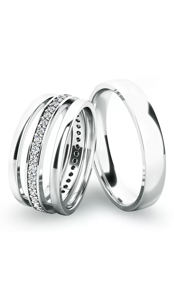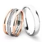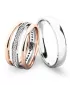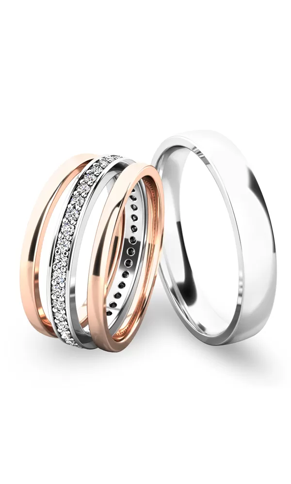 • Ružové - biele zlato:dámsky prsteň so zirkónmi a pánsky prsteň je z bieleho zlata a postranné krúžky sú z ružového zlata