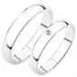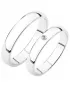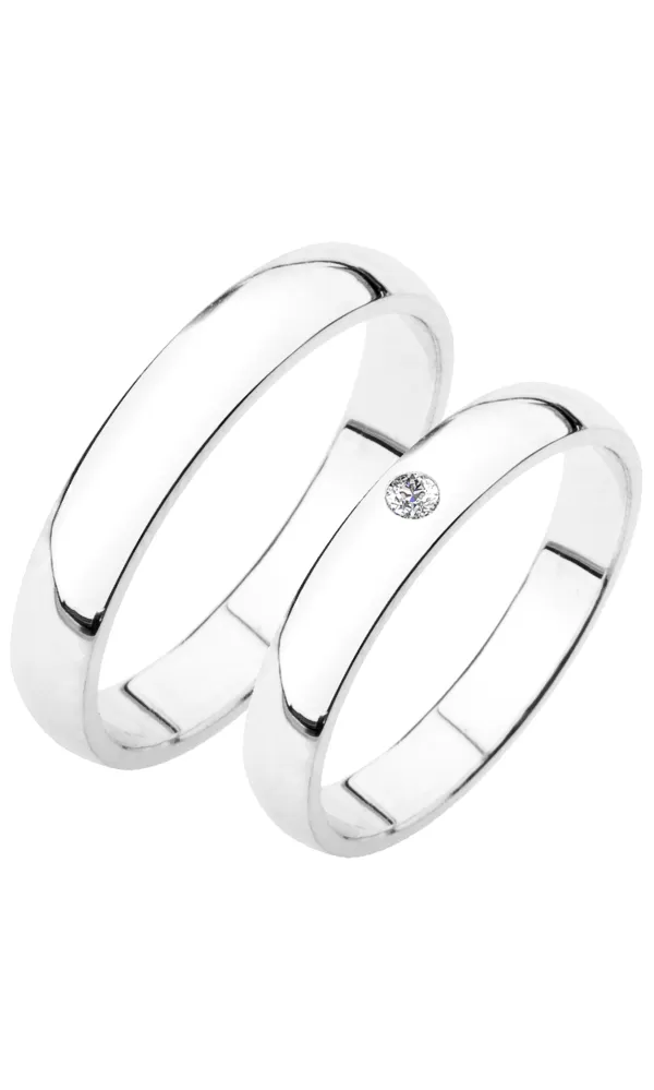 Zlaté snubné prstene z bieleho štrnásťkarátového zlata 585/1000 polguľatého profilu s lesklou povrchovou úpravou. V dámskom prsteni je vsadený jeden okrúhly zirkón popr. diamant briliantového brusu. Snubné prstene je možné vyrobiť v rôznych šírkach napr. 4 alebo 5mm a v rôznych povrchových úpravách napr. zamatový mat.