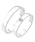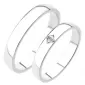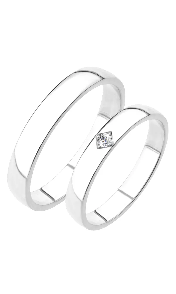 Zlaté snubné prstene z bieleho štrnásťkarátového zlata 585/1000 mierne polguľatého profilu s lesklou povrchovou úpravou. V dámskom prsteni je vsadený jeden okrúhly zirkón popr. diamant briliantového brusu. Snubné prstene je možné vyrobiť v rôznych šírkach napr. 4,00mm av rôznych povrchových úpravách napr. kombinácia lek - zamatový mat.