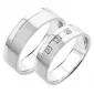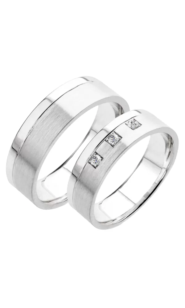Širšie snubné prstene z bieleho štrnásťkarátového zlata 585/1000 rovného profilu s kombinovanou povrchovou úpravou lesk - zamatový mat, ktorý je oddelený lesklou ryhou. V dámskom prsteni sú vsadené do štvorčekov tri okrúhle zirkóny popr. diamanty briliantového brusu. Snubné prstene je možné upraviť podľa vašich predstáv - zmena šírky, farebné kombinácie zlata, počtu kameňov atď.