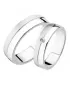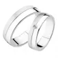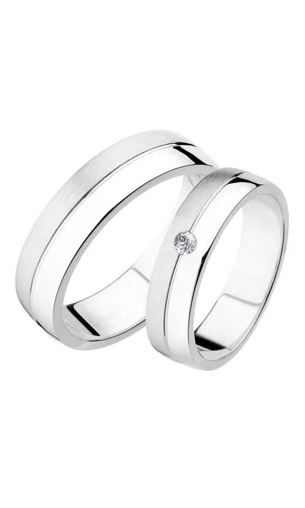 Veľmi obľúbený vzor snubných prsteňov pologuľatého profilu vyrobené z bieleho štrnásťkarátového zlata 585/1000 s kombinovanou povrchovou úpravou lesk-zamatový mat as lesklou ryhou. V dámskom prsteni je vsadený jeden okrúhly zirkón popr. diamant briliantového brusu. Snubné prstene je možné vyrobiť v rôznych farebných kombináciách zlata as ľubovoľným počtom kameňov napr. s tromi alebo s ôsmimi po celom obvode. Ďalej je možné snubné prstene urobiť užšie - nižšia cena alebo širšie - vyššia cena.