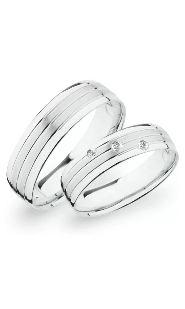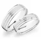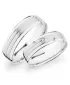 Snubné prstene mierne polguľatého profilu vyrobené z bieleho štrnásťkarátového zlata 585/1000 s vnútorným fit profilom - zaoblenie vnútornej strany pre príjemnejšie nosenie s kombinovanou povrchovou úpravou lesk - zamatový mat as tromi lesklými ryhami po celom obvode prsteňov. V dámskom prsteni sú vsadené tri okrúhle zirkóny s briliantovým brusom Signity star, ktorý dodáva zirkónom oslnivú brilanciu. Do snubných prsteňov si môžete nechať staviť aj diamanty. Kamene sú vsadené do prsteňa "na hladko". Vsadzovanie zirkónov aj diamantov vykonávajú naši najskúsenejší majstri zlatníci ručne pod mikroskopom s presnosťou na 0,01 mm a preto nehrozí vypadnutie kamienkov ako to býva u strojne vyrábaných snubných prsteňov. Snubné prstene je možné vyrobiť v rôznych farebných kombináciách zlata. Ďalej je možné snubné prstene urobiť napr. užšia - nižšia cena alebo širšia - vyššia cena.