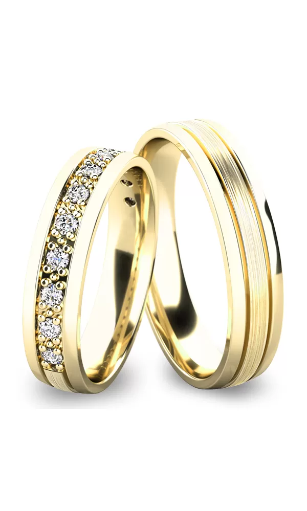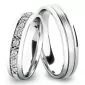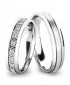 Snubné prstene jednoduchého, ale "večného dizajnu" vyrobené v mierne polguľatom profile z bieleho štrnásťkarátového zlata 585/1000 v kombinovanej povrchovej úprave lesk - mat, kedy prostredná časť je matná a krajné časti sú lesklé. Lesklé a matnú časť oddeľujú lesklé ryhy. Snubné prstene majú vnútorné Fit Profil - polguľatú vnútornú stranu pre príjemnejšie nosenie, nasadzovanie a odnímanie. V dámskom prsteni je vsadené po 11ks okrúhlych zirkónov s briliantovým brusom Signity star, ktorý dodáva zirkónom oslnivú brilanciu. Do snubných prsteňov si môžete nechať staviť aj diamanty. Kamene sú do prsteňa vsadené "do zrniek". Vsadzovanie zirkónov aj diamantov vykonávajú naši najskúsenejší majstri zlatníci ručne pod mikroskopom s presnosťou na 0,01 mm a preto nehrozí vypadnutie kamienkov ako to býva u strojne vyrábaných snubných prsteňov.