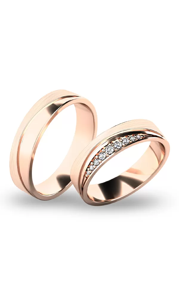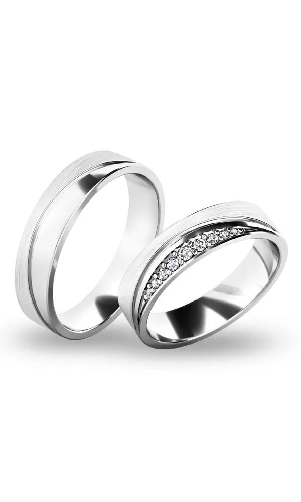 Moderné snubné prstene rovného profilu vyrobené z bieleho štrnáctikarátového zlata 585/1000 v kombinovanej povrchovej úprave lesk/mat. zirkónov s briliantovým brusom Signity star, ktorý zaručuje zirkónom oslnivú brilanciu. Do snubných prsteňov si môžete nechať tiež vsadiť diamanty. preto nehrozí vypadnutie kamienkov ako to býva u strojne vyrábaných snubných prsteňov.