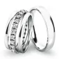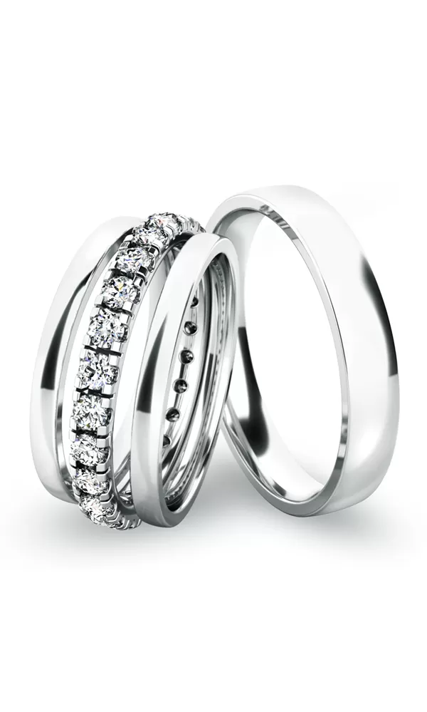 Novinka pre tento rok! Set snubných prsteňov je vyrobený z bieleho štrnásťkarátového zlata 585/1000. Prstene majú vonkajší polguľatý profil a sú v lesklej povrchovej úprave, samozrejme je možné akýkoľvek prsteň vyrobiť v matnej povrchovej úprave. Snubné prstene majú vnútorné Fit Profil - polguľatú vnútornú stranu pre príjemnejšie nosenie, nasadzovanie a odnímanie. V dámskom prsteni je vsadené po celom obvode 24ks (počet je závislý na veľkosti dámskeho prsteňa) okrúhlych zirkónov s briliantovým brusom Signity star, ktorý dáva zirkónom oslnivú brilanciu. Do snubných prsteňov si môžete nechať staviť aj diamanty. Kamene sú do prsteňa vsadené "do krapničiek". Vsadzovanie zirkónov aj diamantov vykonávajú naši najskúsenejší majstri zlatníci ručne pod mikroskopom s presnosťou na 0,01 mm a preto nehrozí vypadnutie kamienkov ako to býva u strojne vyrábaných snubných prsteňov.