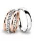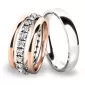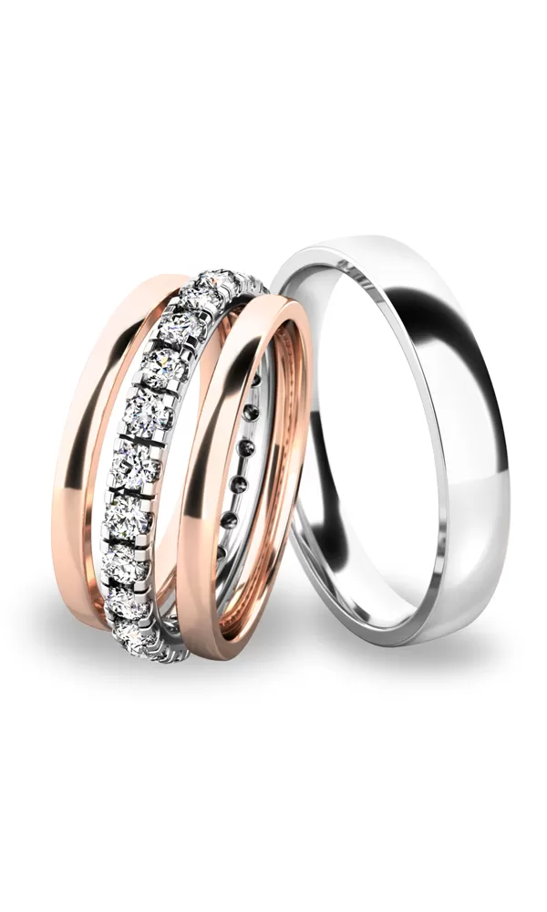 • Ružové - biele zlato:dámsky prsteň so zirkónmi a pánsky prsteň je z bieleho zlata a postranné krúžky sú z ružového zlata