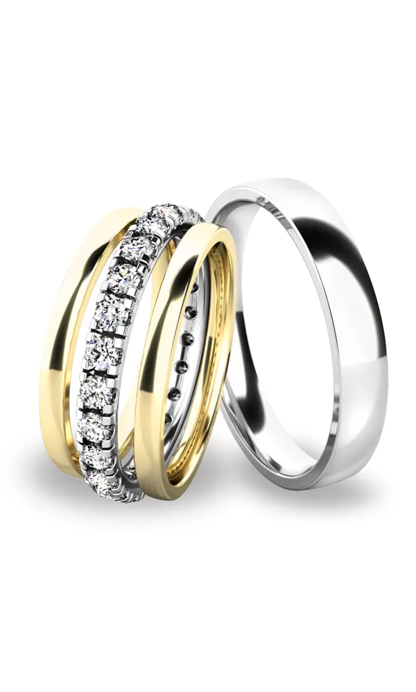 • Žlté - biele zlato:dámsky prsteň so zirkónmi a pánsky prsteň je z bieleho zlata a postranné krúžky sú zo žltého zlata