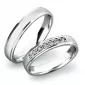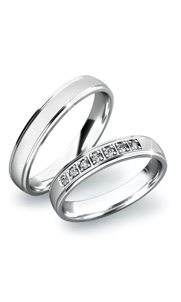 Snubné prstene mierne polguľatého profilu vyrobené z bieleho štrnásťkarátového zlata 585/1000 v kombinácii lesklej a matnej povrchovej úpravy. Snubné prstene majú vnútorné Fit Profil - polguľatú vnútornú stranu pre príjemnejšie nosenie, nasadzovanie a odnímanie. V dámskom prsteni je vsadených sedem okrúhlych zirkónov s briliantovým brusom Signity star, ktorý dodáva zirkónom oslnivú brilanciu. Do snubných prsteňov si môžete nechať staviť aj diamanty. Kamene sú do prsteňa vsadené "do krapničiek". Vsadzovanie zirkónov aj diamantov vykonávajú naši najskúsenejší majstri zlatníci ručne pod mikroskopom s presnosťou na 0,01 mm a preto nehrozí vypadnutie kamienkov ako to býva u strojne vyrábaných snubných prsteňov.