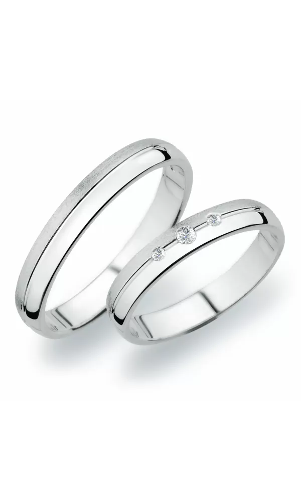 Snubné prstene vyrobené z bieleho štrnásťkarátového zlata 585/1000 polguľatého profilu s kombinovanou povrchovou úpravou lesk - diamantový mat, ktorý je oddelený jemnou ryhou. V dámskom prsteni sú vsadené tri okrúhle zirkóny s briliantovým brusom Signity star, ktorý dodáva zirkónom oslnivú brilanciu. Do snubných prsteňov si môžete nechať staviť aj diamanty. Kamene sú vsadené do prsteňa "na hladko". Vsadzovanie zirkónov aj diamantov vykonávajú naši najskúsenejší majstri zlatníci ručne pod mikroskopom s presnosťou na 0,01 mm a preto nehrozí vypadnutie kamienkov ako to býva u strojne vyrábaných snubných prsteňov. Snubné prstene je možné vyrobiť v rôznych farebných kombináciách zlata as ľubovoľným počtom kameňov. Ďalej je možné snubné prstene urobiť užšie - nižšia cena alebo širšie - vyššia cena.
